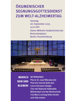 Die Alzheimer Gesellschaft Berlin e.V. organisiert rund um den Welt-Alzheimertag mehrere Veranstaltungen: Unter anderem eine Schulung für pflegende Angehörige mit dem Schwerpunkt Frontotemporale Demenz (FTD) am 19. und 20 September, ein Offenes Forum zum Thema "Umgang und Kommunikation mit Menschen mit Demenz" am 22. September, der Tag der Offenen Tür der Alzheimer Gesellschaft Berlin am 25. September mit Filmen, Diskussionen und Beiträgen sowie einen ökumenischen Segnungsgottesdienst am 28. September.