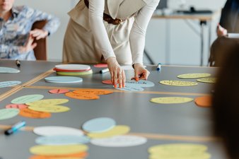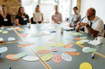 Am Nachmittag wurde die Gruppe geöffnet. Zu Beginn notierten alle Teilnehmer*innen Antworten zu vier Fragen rund um Kommunikation und Netzwerken. Im Anschluss wurden die Antworten in Kleingruppen diskutiert. Danach trafen sich alle wieder im großen Kreis um den Gruppentisch. Die Antworten wurden mithilfe eines Lotus-Diagramms geclustert. Dazu wurde ein Problem auf einer Karte platziert und um dieses herum wurden Lösungen für dieses Problem angelegt. So konnte die Gruppe erkennen, welche Probleme immer wieder auftreten und mit welchen Möglichkeiten andere Teilnehmer*innen diese erfolgreich lösen konnten.