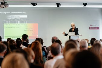 Der erste Veranstaltungsteil im Plenum wurde mit einer Keynote von Prof. Monique Breteler abgeschlossen, die seit vielen Jahren zur Prävention von Demenz forscht. Sie hob hervor, dass sich Demenz über Jahrzehnte entwickelt, und forderte deshalb gezielte Präventionsmaßnahmen, die an den Stellen ansetzen, an denen Demenz möglichst wirksam verhindert oder verzögert werden kann.