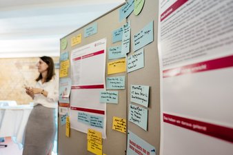In der Arbeitsgruppe 1 ging es um Menschen mit Demenz im Quartier. Die Teilnehmer*innen diskutierten über integrierte Quartiers- und Dorfentwicklungskonzepte (Maßnahme 1.1.2), demenzsensible öffentliche Begegnungs- und Verweilräume (Maßnahme 1.1.4) sowie die Öffnung von Pflegeheimen ins Quartier (Maßnahme 1.8.5)., sammelten Stichpunkte und füllten damit drei Poster.