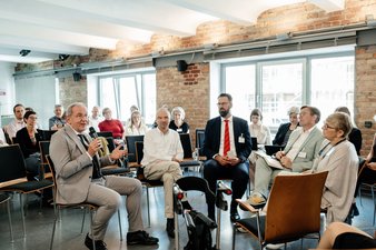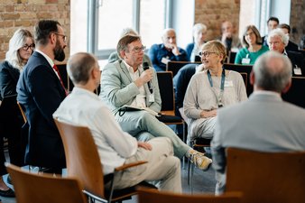 zusammensetzte, in der sich darüber ausgetauscht werden sollte, wie es mit der Nationalen Demenzstrategie weitergeht. Bei dieser speziellen Diskussionsform gibt es einen Innenkreis, in dem Redner*innen auf fest zugewiesenen Plätzen sitzen. EIn Platz bleibt frei, und kann von Interessierten aus dem Publikum, das um den Kreis (das "Goldfischglas"/ die "Fish Bowl") herum sitzt, beansprucht werden, um einen Redebeitrag zu leisten. Im Innenkreis saßen Sven Paul vom Bundesministerium für Familie, Senioren, Frauen und Jugend, Eckard Cappell, Vetretrer der Gesundheitsministerkonferenz und der Länder, Dr. Albert Kern vom Bundesgesundheitsministerium, Lieselotte Klotz vom "Beirat Leben mit Demenz" sowie Prof. René Thyrian vom DZNE. Vertreter*innen der DAlzG, der AG Landesfachstellen, der Malteser, der Türkisch-Islamischen Union der Anstalt für Religion e. V. (DİTİB) und der Aktion Psychisch Kranke e.V. sowie des Bundesverbands haushaltsnaher Dienstleistungs-Unternehmen (BHDU) und des Bundesministeriums für Bildung und Forschung brachten als Teilnehmer*innen auf dem freien Stuhl im Laufe der Diskussion Anregungen und Antworten ein. Einig waren sich die Teilnehmer*innen unter anderem darüber, dass es klare Ziele braucht, Kommunikation sehr wichitg ist und eine eventuelle Neuauflage nach dem Motto "weniger ist mehr" verschlankt werden sollte