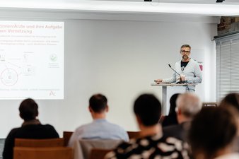 Daniel Lichy von der Landesfachstelle Demenz Mecklenburg-Vorpommern, Deutsche Alzheimer Gesellschaft Landesverband Mecklenburg-Vorpommern e.V. schilderte in seinem Vortrag Herausforderungen bei der Versorgung von Menschen mit Demenz im ländlichen Raum. Hausärzt*innen spielen für Patient*innen im ländlichen Raum meist eine besonders wichtige Rolle, doch auch hier zeigt sich: interdisziplinäre Zusammenarbeit hilft allen weiter, ein Netz an Unterstützung kann alle Beteiligten entlasten.
