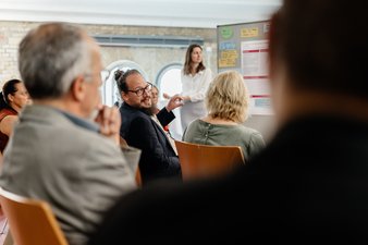 Die Teilnehmer*innen der Arbeitsgruppe 2 zum Thema "Beratung und Begleitung von Menschen mit Demenz und ihren Angehörigen" hörten zu Beginn der Arbeitsgruppenphasen je zwei Inputs von Expert*innen und diskutierten anschließend, welche Erkenntnisse, Herausforderungen und Potenziale sich aus dem Gehörten ableiten lassen. So wurden am Vormittag das Projekt SABdfam (Maßnahme 2.8.2 Stärkung der psychosozialen Teilhabe) sowie Qualitätsstandards für die Beratung von Menschen mit Demenz vorgestellt - am Nachmittag gab es einen Input zum Dementia Care Management (Maßnahme 2.1.1) und zur S3-Leitlinie Demenzen, insbesondere im Hinblick auf nicht-medikamentöse Interventionen.