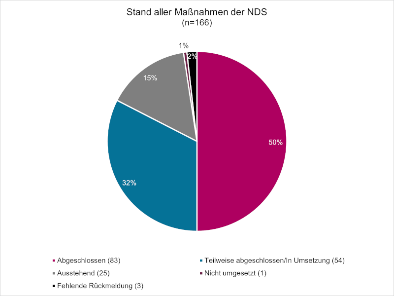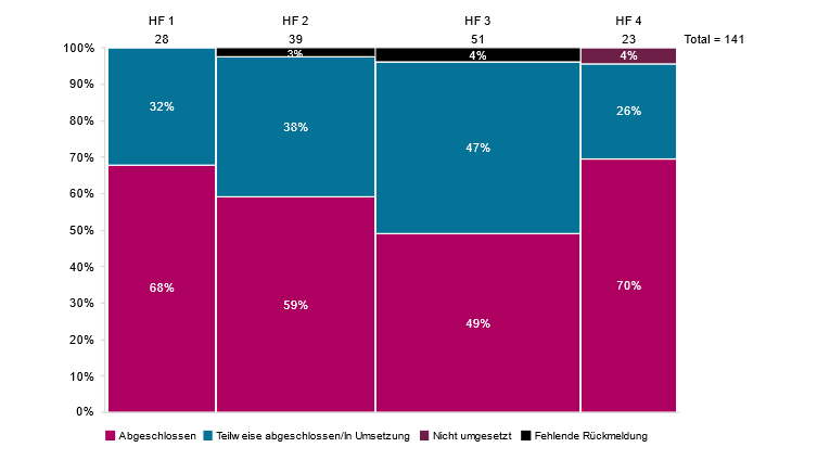 | Teilweise abgeschlossen / in Umsetzung | 23 (35%) | 54 (38%) | 54 (32%) |