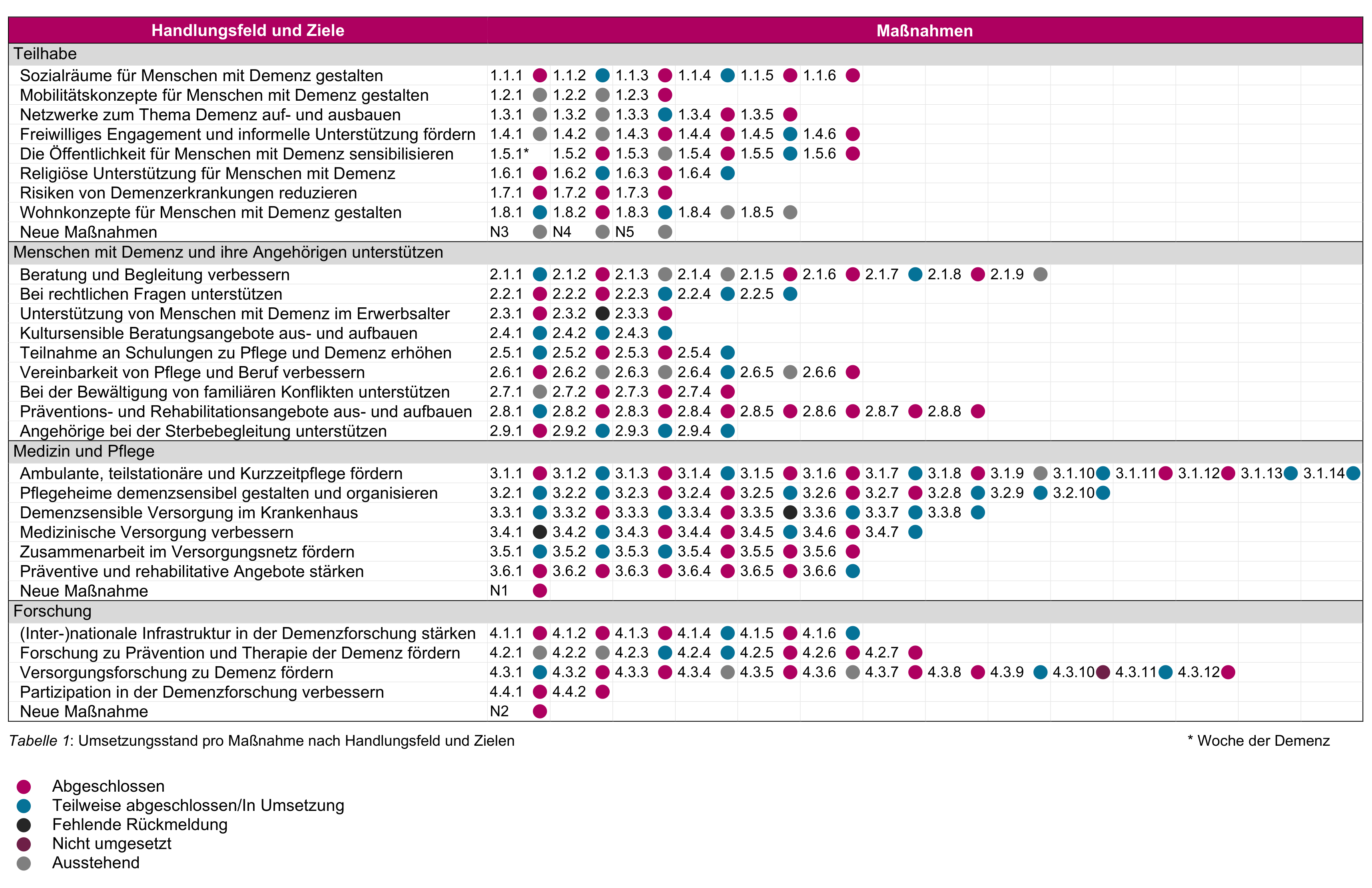 Im Rahmen des Monitorings wurde unter anderem auch der Stand aller in der Nationalen Demenzstrategie enthaltenen Maßnahmen dargestellt: